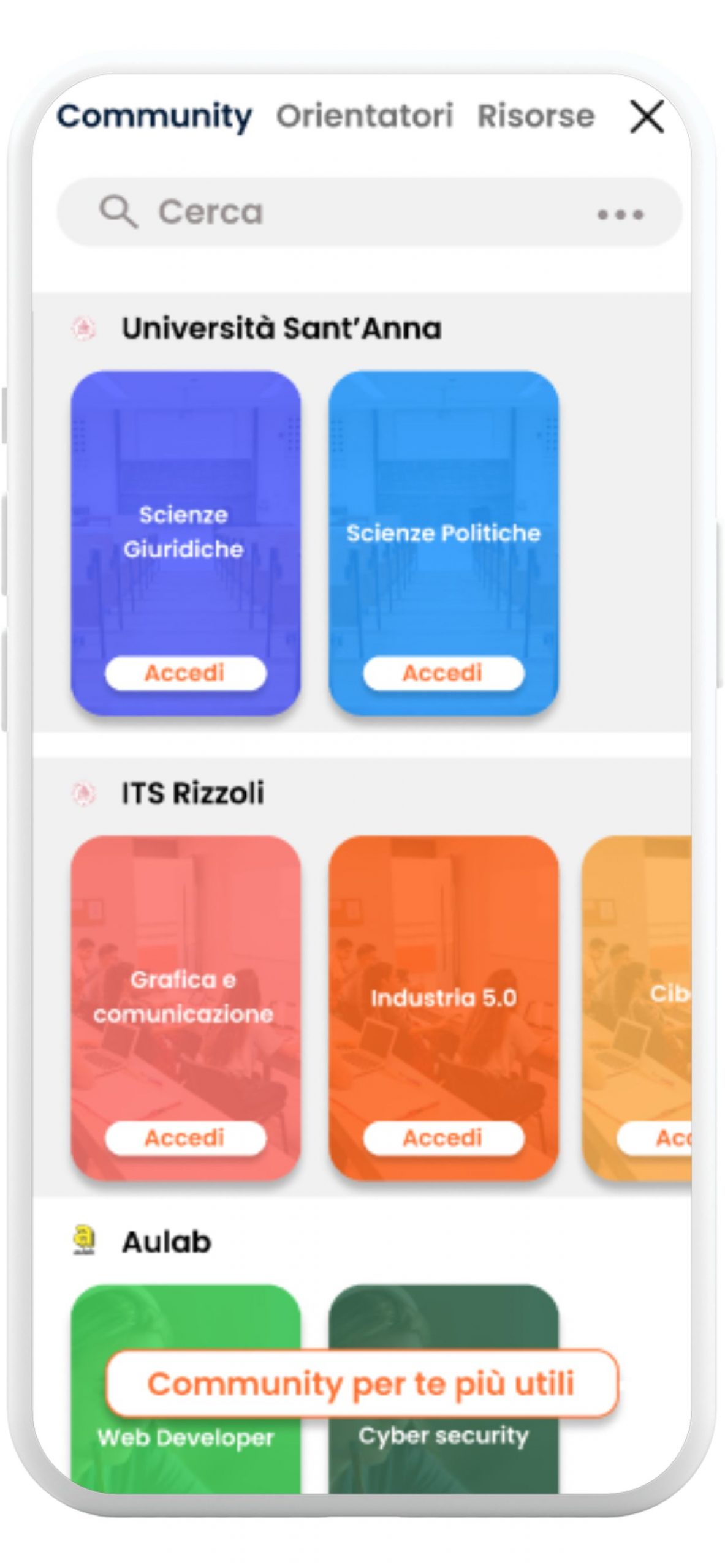 Ogni Università, ITS o ente di formazione partner* ha una propria community dove gli studenti possono ricevere supporto e informazioni dai già alunni di quel corso/indirizzo.